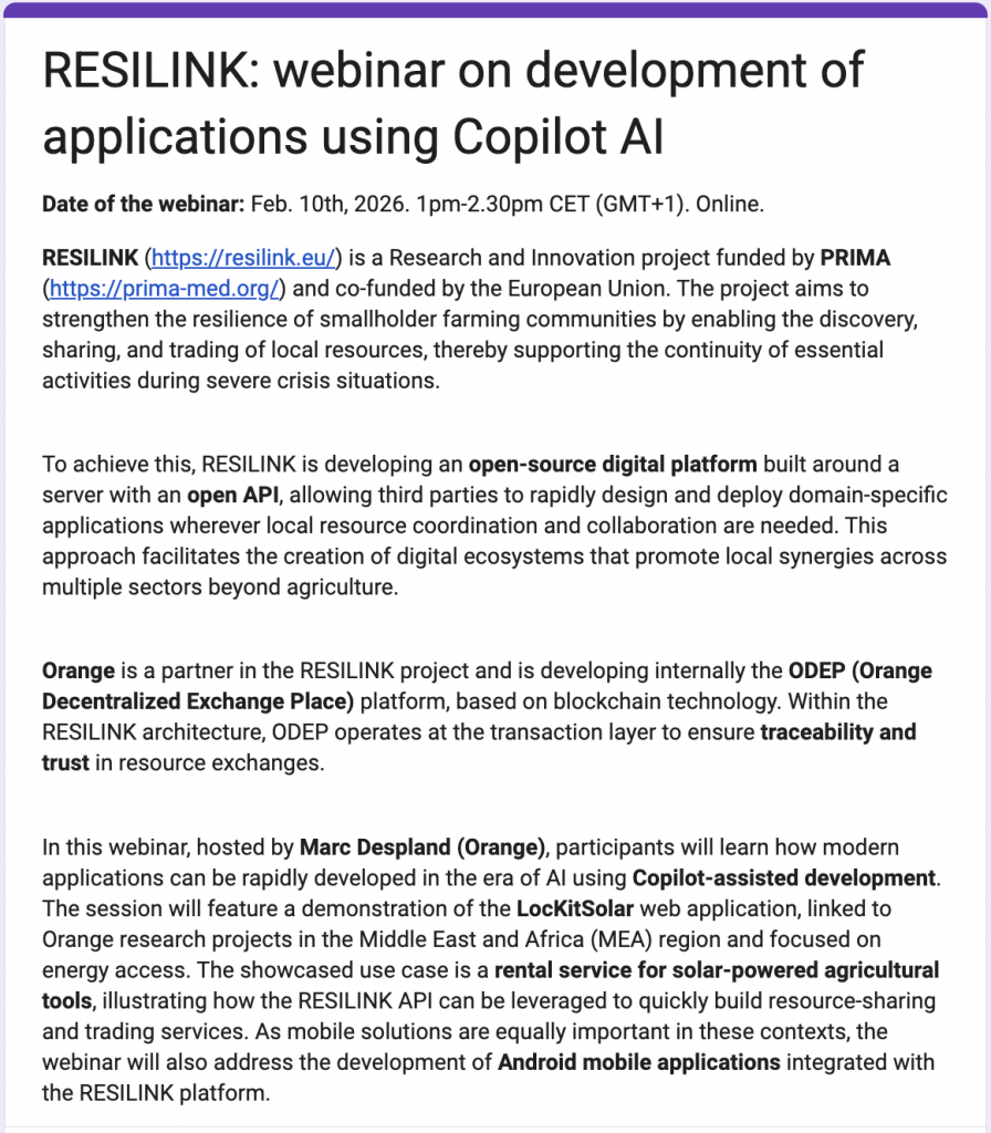 RESILINK will organize a webinar on development of applications using Copilot AI. In this webinar, that will be animated by Marc Despland (senior software architect at Orange Innovation), participants will learn how modern applications can be rapidly developed in the era of AI using Copilot-assisted development. The session will feature a demonstration of the LocKitSolar web application, linked to Orange research projects in the Middle East and Africa (MEA) region and focused on energy access. The showcased use case is a rental service for solar-powered agricultural tools, illustrating how the RESILINK API can be leveraged to quickly build resource-sharing and trading services. As mobile solutions are equally important in these contexts, the webinar will also address the development of Android mobile applications integrated with the RESILINK platform. With revolutionary AI assistant tools, the development of applications is entering a new era where it will be easier to exploit and scale out results from R&D projects, beyond the project lifetime.